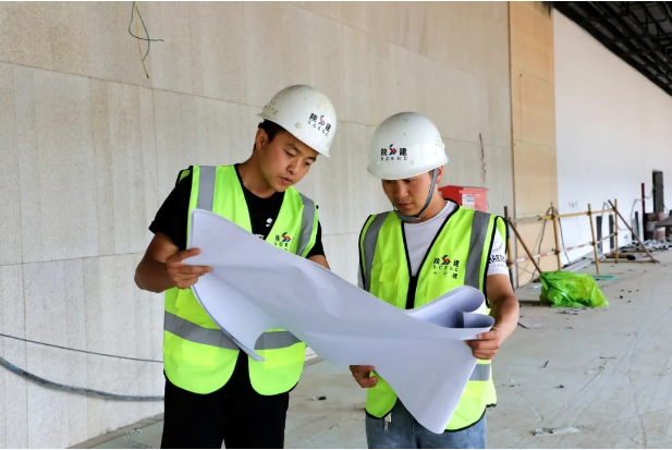 圖為閆雄雄(右)在施工現(xiàn)場(chǎng)對(duì)設(shè)計(jì)圖紙進(jìn)行交底