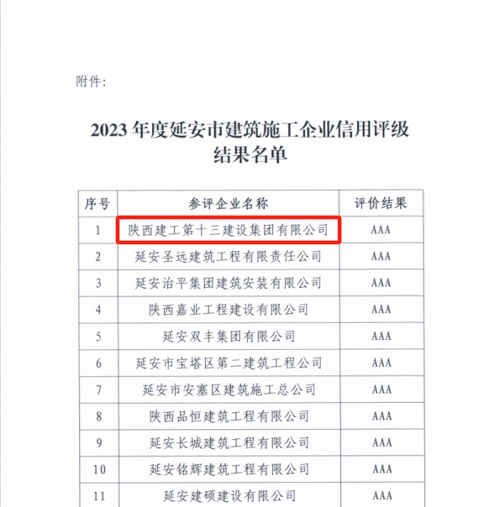 同時(shí),延安市建協(xié)公布了2023年度延安市建筑施工企業(yè)信用評級結(jié)果:陜建十三建集團(tuán)被評為AAA級企業(yè)。